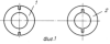 Чистящий элемент состоит из двух тонких (0,3 мм) и жестких пластмассовых колец 1 с внутренним диаметром 12 мм и наружным диаметром 24 мм (внутренний диаметр очищаемых трубок равен 26 мм), имеющих по две радиальные и симметричные между собой (шириной 1 мм) узкие прорези с наружной стороны колец 1 на глубину 1/2 ширины колец, т.е. на 3 мм. На двух других кольцах 2 сделаны по два также прореза, но с внутренней стороны кольца 2.