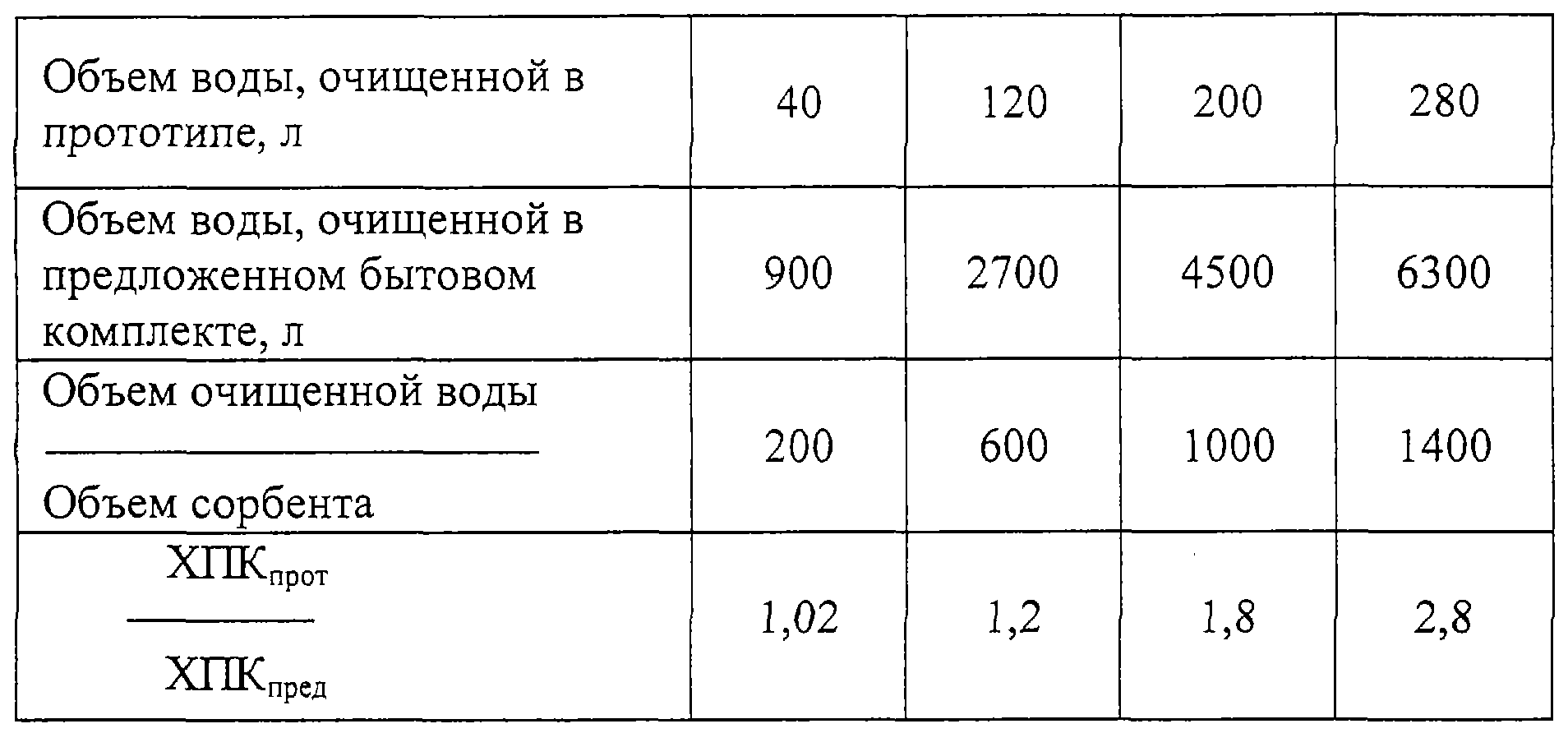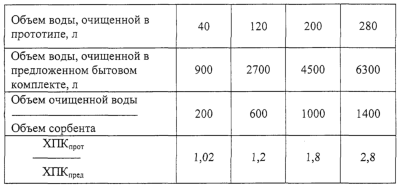 Эффективность процесса очистки воды оценивалась по перманганатной окисляемости (ХПК), являющейся интегральной характеристикой степени очистки воды, путем анализа проб по стандартной методике. Для большей наглядности сравнения результаты анализов представлены как отношение ХПК воды, очищенной в прототипе (ХПКпрот), к ХПК воды, очищенной в предложенном водоочистителе (ХПКпред), взятыми при одинаковых значениях отношения объема очищенной воды к объему очищающего сорбента. Количество времени нахождения очищаемой воды в статическом режиме в слое сорбента 5 предложенного комплекта составляло 20 минут и было равно количеству времени, затрачиваемому в прототипе на предварительное озонирование и пропускание через фильтр “Барьер” воды в количестве 1,2 л. Кроме испытаний, направленных на сопоставление эффективности очистки воды в известном и предложенном бытовых комплектах, результаты которых представлены в таблице, были также проведены в предложенном бытовом комплекте дополнительные испытания: 1) с более длительной сорбционной очисткой воды (60 минут) без изменения времени озонирования; 2) с более длительным озонированием; 3) с модельным раствором (сточная вода, прошедшая биологическую очистку) с исходной высокой степенью загрязнений.