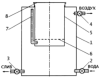 На чертеже представлена технологическая схема машины. Бытовая стиральная машина содержит корпус 1 с питающим краном 2, сливным краном 3 и клапаном 4. В верхней части корпуса установлена рабочая емкость 5. В нижней части рабочей емкости горизонтально расположена решетка 6. Между днищем рабочей емкости и решеткой установлена воздухопроводная трубка 7. Загрузочное отверстие в верхней части корпуса 1 закрывает крышка 8.
