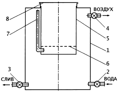 Работает стиральная машина следующим образом. Питающий кран подключается к водопроводу. В рабочую емкость 5 закладывается белье, заливается горячая вода и засыпается стиральный порошок. Емкость закрывается крышкой 8. Через впускной кран из водопровода подается вода, которая заполняет внутреннюю полость корпуса. Воздух, находящийся в полости под давлением воды, через соединительную трубку 7 попадает в рабочую емкость 5, организуя перемешивание стирального раствора. Излишки воздуха уходят через отверстия в крышке 8. После завершения цикла стирки питающий кран закрывается, и открываются сливной кран 3 и клапан 4, посредством которого выравнивается давление воздуха внутри корпуса и снаружи. Вода из корпуса сбрасывается через сливной кран 3, после чего он и клапан 4 закрываются. При необходимости цикл стирки повторяется.
