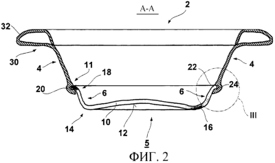 Это удлинение 22 заходит в верхний конец 20 участка 4, составляющего боковую стенку, таким образом, что находится в прочном зацеплении с канавкой 24 соответствующей конфигурации на внутреннем конце 11 бокового участка 4. Предпочтительно соединение выполнено за счет того, что верхний конец 18 предварительно отформованного смотрового стекла 10 вместе с удлинением 22 при формовании литьем под давлением составляющего боковую стенку участка 4 замоноличивается его верхним концом 20. В альтернативном исполнении составляющий боковую стенку участок 4 из синтетического материала в размягченном горячем состоянии может экструдироваться на удлинение 22 смотрового стекла 10. Форма составляющего боковую стенку участка 4 может выбираться таким образом, что наружный конец 30 составляющего боковую стенку участка 4 выполняется за одно целое в виде кольцеобразной рамы 32 люка.