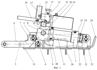 Инструмент также может быть использован в качестве домкрата для подъема рельсошпальной решетки. В этом случае отвинчивают винты 20 и 24, поднимают за ручку 16 силовой блок с рамы 1 и устанавливают выходной частью штока 21 в опорную плиту (не показана), ручкой 16 лапу 27 подталкиваем под подошву рельса. Качанием рукоятки 15 нагнетаем давление в гидроцилиндре 11, корпус 18 гидроцилиндра 11 поднимается и лапой 27 поднимает рельс 24. Ручкой 15 отодвигаем силовой блок, лапу 27 убираем из-под рельса 25, краном 23 сбрасываем давление в гидроцилиндре 11 и корпус принимает исходное положение.