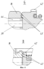 Расточки больших ступеней 26 опорных втулок 24 обоих устройств управления 20 и 21 закольцованы между собой каналами 37, 37а и 37б и соединены со сливным каналом 38 исполнительного механизма. Кинематическая связь между подпружиненным обратным тарельчатым клапаном 27 с перепускным устройством 16 и плунжером 28 осуществляется через ступенчатый цилиндрический индикаторный стержень 39, который своими рабочими торцами 40 и 41 взаимодействует с торцовыми поверхностями перегородки 29 плунжера 28 и поверхностью запорного органа обратного клапана 27, образованного в виде плоского тарельчатого затвора с наружной сферической направляющей частью 42 (см. фиг.6) и притертого к уплотнительным кромкам 43 поршня-седла 16, выполненным в виде кольцевых концентрично расположенных ножевых выступов. Между наружной поверхностью малой ступени индикаторного стержня 39 и поверхностью внутренней расточки поршня-седла 16 образован гарантированный кольцевой зазор 44 для прохода рабочей среды в сливной канал 45 или 46 (фиг.2). Клапан переключения подключен к источникам командного давления – электромагнитным клапанам 47 и 48 (фиг.1), дистанционно управляемым из кабины по сигналу летчика.