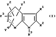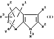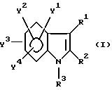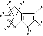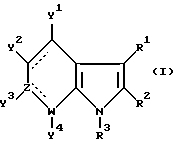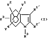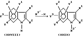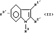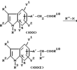 Примерами характерных соединений данного изобретения являются производные индола, показанные формулой (I-I):![]() где все группы-заместители соответствуют описанным ниже, а неупоминаемые представляют собой водород (см. в конце описания). Соединения данного изобретения могут быть получены различными способами, хорошо известными per se, для получения соединений этого типа. Например, они могут быть получены, как иллюстрируется в следующих далее схемах реакций A – K. Схема реакций A Соединения формулы (I), в которой R3 обозначает атом водорода и Y3 обозначает карбоксиметильную группу, т.е. соединения формулы (XIII), могут быть получены, как показано в следующей схеме реакций: В этой схеме исходный материал, соединение формулы (XI), может быть получен согласно процедуре, описанной в Chem. Ber. 95, 2205 (1962). В представленных выше формулах R1, R2, R3, Y1, Y2 и Y4 имеют указанные выше значения. Стадия A1; В этой стадии соединение карбоновой кислоты формулы (XII) получают гидролизом цианосоединения формулы (XI). Эту реакцию выполняют обычно и предпочтительно в присутствии растворителя, предпочтительно водного растворителя. Нет особого ограничения в отношении природы этого используемого растворителя при условии, что он не оказывает неблагоприятного действия на реакцию или на участвующие в ней реагенты и что он может растворять реагенты, по меньшей мере до некоторой степени. Примеры подходящих растворителей включают в себя: простые эфиры, такие как диэтиловый эфир, тетрагидрофуран, диоксан или диметоксиэтан; спирты, такие как метанол или этанол; и смеси спиртов и воды. Из них мы предпочитаем спирты или смесь спирта и воды. Также нет особого ограничения в отношении природы используемого основания, и любое основание, применяемое в общепринятых реакциях гидролиза, может быть равным образом использовано здесь. Примеры подходящих оснований включают в себя: карбонаты щелочных металлов, такие как карбонат натрия, карбонат калия или карбонат лития; гидроксиды щелочных металлов, такие как гидроксид лития, гидроксид натрия или гидроксид калия; и гидроксиды щелочноземельных металлов, такие как гидроксид бария. Из них мы предпочитаем гидроксид натрия или гидроксид калия. Реакция с основанием может происходить в широком диапазоне температур и точная температура реакции не является критической для изобретения. Предпочтительная температура реакции будет зависеть от таких факторов, как природа растворителя и исходный материал или используемый реагент. Однако, в общем, мы считаем удобным проведение этой реакции при температуре от 0oC до 150oC или при температуре перегонки реакционной среды. Время, необходимое для этой реакции, может также широко варьировать в зависимости от многих факторов, таких как температура реакции и природа используемых реагентов и растворителя. Однако, при условии, что реакцию проводят при описанных выше предпочтительных условиях, обычно будет достаточным период от 30 минут до 24 часов, более предпочтительно от 1 до 10 часов. После завершения этой реакции желаемое соединение можно извлечь из реакционной смеси стандартными методами. Например, один подходящий для этого способ предусматривает: промывание органической фазы, содержащей целевое соединение; отделение органической фазы, содержащей желаемое соединение; высушивание полученного раствора над о