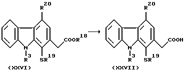 Пример 45Трет-бутил-(9-бензил-1-метилтиокарбазол-2-илокси)ацетат Согласно процедуре и с применением относительных соотношений исходных материалов, сходных с описанными в примере 28, но с применением трет-бутил-(1-метилтиокарбазол-2-илокси)ацетата, полученного в примере 43, в качестве исходного материала получали указанное в заголовке соединение в виде масла с выходом 94%. Пример 46 (9-Бензил-1-метилтиокарбазол-2-илокси)уксусная кислота Согласно процедуре и с применением относительных соотношений исходных материалов, сходных с описанными в примере 3, но с применением трет-бутил-(9-бензил-1-метилтиокарбазол-2-илокси)ацетата, полученного в примере 45, в качестве исходного материала указанное в заголовке соединение, плавящееся при 188-189oC, получали с количественным выходом. Спектр ЯМР (CDCl3, 270 МГц), м.д.:2,04 (3H, синглет); 4,85 (2H, синглет); 6,25 (2H, синглет); 6,89 (1H, дублет, J=8,2 Гц); 7,01 (2H, дублет, J=6,7 Гц); 7,1-7,5 (6H, мультиплет); 8,05 (1H, дублет, J=7,9 Гц); 8,10 (1H, дублет, J=8,4 Гц). Пример 47 (2-гидрокси-1-оксо-1,2,3,4-тетрагидрокарбазол-2-ил)уксусная кислота Согласно процедуре и с применением относительных соотношений исходных материалов, сходных с описанными в примере 3, но с применением трет-бутил-2-гидрокси-1-оксо-1,2,3,4-тетрагидрокарбазол-2-ил)ацетата, полученного в примере 2, в качестве исходного материала получали указанное в заголовке соединение, плавящееся при 156-157oC, с выходом 98%. Спектр ЯМР (d6-DMSO, 270 МГц), м.д.:2,34 (1H, двойной дублет дублетов, J=5,2, 8,3, 13,5 Гц); 2,55 (1H, триплет дублетов, J=5,2, 13,5 Гц); 2,72 (2H, синглет); 3,03 (1H, двойной дублет дублетов, J=5,2, 8,3, 17,3 Гц); 3,20 (1H, триплет дублетов, J=5,2, 17,3 Гц); 7,10 (1H, триплет, J=7,8 Гц); 7,32 (1H, триплет, J=7,8 Гц); 7,46 (1H, дублет, J=7,8 Гц); 7,62 (1H, дублет, J=7,8 Гц); 11,1 (1H, широкий синглет). Пример 48 Этил-1,2,3,4-тетрагидрокарбазол-3-карбоксилат Раствор 1,08 г фенилгидразина и 1,84 г этил-4-оксоциклогексанкарбоксилата в 25 мл уксусной кислоты кипятили с обратным холодильником в течение 30 минут и затем выливали в ледяную воду. Водный слой экстрагировали этилацетатом и органический экстракт промывали насыщенным водным раствором NaHCO3, сушили над безводным сульфатом магния и концентрировали выпариванием при пониженном давлении. Полученный осадок подвергали колоночной хроматографии с использованием 50 г силикагеля со смесью 4:1 (масса/масса) гексана и этилацетата в качестве элюента и затем перекристаллизовывали из этилацетата и гексана, получая 2,28 г указанного в заголовке соединения, плавящегося при 95-96oC. Спектр ЯМР (CDCl3, 270 МГц), м.д.:1,30 (3H, триплет, J=7,1 Гц); 1,9-2,1 (1H, мультиплет); 2,2-2,4 (1H, мультиплет); 2,7-3,0 (4H, мультиплет); 3,08 (1H, дублет дублетов, J=5,1, 15,1 Гц); 4,20 (2H, квартет, J=7,1 Гц); 7,08 (1H, триплет, J=7,1 Гц); 7,13 (1H, триплет, J=7,1 Гц); 7,27 (1H, дублет, J=7,1 Гц); 7,47 (1H, дублет, J=7,1 Гц); 7,72 (1H, широкий синглет). Пример 49 1,2,3,4-Тетрагидрокарбазол-3-карбоновая кислота Согласно процедуре и с применением относительных соотношений исходных материалов, сходных с описанными в примере 26, но с применением этил-1,2,3,4-тетрагидрокарбазол-3-карбоксилата, полученного в примере 48, в качестве исходного материала указанное в заголовке соединение, плавящееся при 198-199oC, получали с выходом 95%. Спектр ЯМР (CDCl3, 270 МГц), м.д.:2,0-2,2 (1H, мультиплет); 2,2-2,4 (1H, мультиплет); 2,7-3,2 (5H, мультиплет); 7,09 (1H, триплет, J=6,8 Гц); 7,14 (1H, триплет, J=6,8 Гц); 7,29 (1H, дублет, J=6,8 Гц); 7,48 (1H, дублет, J=6,8 Гц); 7,73 (1H, широкий синглет). Пример 50 Бензил-1,2,3,4-тетрагидрокарбазол-3-карбоксилат 5,53 г порошкообразного карбоната ка