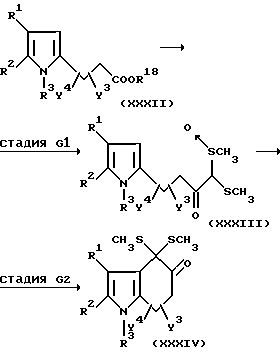 Схема реакций GЭта схема реакции дает производное индола, имеющее две метилтиогруппы при положении 4 и оксогруппу при положении 5, которое может быть ценным исходным материалом для получения некоторых соединений данного изобретения: ![]() В приведенных выше формулах R1, R2, R3, Y3 и Y4 имеют данные выше значения. Стадия G1 В этой стадии соединение формулы (XXXII) реагирует с метилметилсульфинилметилсульфидом с образованием соединения формулы (XXXIII). Эта реакция предпочтительно имеет место в присутствии кислоты. Нет особого ограничения в отношении природы используемой кислоты, и любая кислота, обычно применяемая в общепринятых реакциях, равным образом может использоваться здесь. Примеры подходящих кислот включают в себя: кислоты Льюиса, такие как трифторид бора, диэтилэфират трифторида бора, тетрахлорид титана и хлорид олова (IV); минеральные кислоты, в частности, галогенводородные кислоты (такие как фтористоводородная кислота, бромистоводородная кислота, иодистоводородная кислота или соляная кислота), азотная кислота, угольная кислота, серная кислота или фосфорная кислота; (низший алкил)сульфоновые кислоты, такие как метансульфоновая кислота, трифторметансульфоновая кислота или этансульфоновая кислота; арилсульфоновые кислоты, такие как бензолсульфоновая кислота или п-толуолсульфоновая кислота; и органические карбоновые кислоты, такие как уксусная кислота или бензойная кислота. Реакцию обычно и предпочтительно выполняют в присутствии растворителя. Нет особого ограничения в отношении природы используемого растворителя, при условии, что он не оказывает неблагоприятного действия на реакцию или на участвующие в ней реагенты и что он может растворять реагенты, по меньшей мере, до некоторой степени. Предпочтительны неполярные растворители. Примеры подходящих растворителей включают в себя: ароматические углеводороды, такие как бензол, толуол или ксилол; простые эфиры, такие как диэтиловый эфир, тетрагидрофуран, диоксан или диметоксиэтан; амиды, такие как диметилформамид, диметилацетамид или гексаметилфосфорный триамид; и сульфоксиды, такие как диметилсульфоксид или сульфолан. Из них мы предпочитаем простые эфиры (в частности, тетрагидрофуран или диметоксиэтан) и амиды (в частности, диметилформамид). Эта реакция может иметь место в широком диапазоне температур, и точная температура реакции не является критической для изобретения. Предпочтительная температура реакции будет зависеть от таких факторов, как природа растворителя и исходный материал и используемый реагент. Однако, в общем, мы считаем удобным проводить эту реакцию при температуре от -78oC до температуры перегонки реакционной среды, более предпочтительно от 0oC до температуры перегонки реакционной среды. Время, необходимое для этой реакции, может также широко варьировать в зависимости от многих факторов, в частности, от температуры реакции и природы используемых реагентов и растворителя. Однако, при условии, что реакцию выполняют при описанных выше предпочтительных условиях, обычно будет достаточным период от 10 минут до 24 часов, более предпочтительно от 30 минут до 6 часов. После завершения реакции желаемое соединение можно извлечь из реакционной смеси общепринятыми способами. Например, один подходящий способ включает в себя: нейтрализацию должным образом реакц