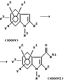 Схема реакции I![]() В приведенных выше формулах R2, R3, Y1 – Y4 имеют указанные выше значения, а R51 обозначает метильную группу или атом водорода. Стадия J В этой стадии содержащее ацетил соединение формулы (XXXVI) получают из индольного соединения формулы (XXXV) реакцией Вильсмейера с применением оксифосфорилхлорида и диметилформамида или диметилацетамида. Эту реакцию обычно и предпочтительно выполняют в присутствии растворителя. Нет особого ограничения в отношении природы используемого растворителя, при условии, что он не оказывает неблагоприятного действия на реакцию или на участвующие в ней реагенты и что он может растворять реагенты, по меньшей мере, до некоторой степени. Примеры подходящих растворителей включают в себя: алифатические углеводороды, такие как гексан; галогенированные углеводороды, такие как метиленхлорид, хлороформ или дихлорэтан; простые эфиры, такие как диэтиловый эфир, тетрагидрофуран, диоксан или диметоксиэтан; и амиды, такие как формамид, диметилформамид или диметилацетамид. Мы предпочитаем использовать диметилформамид или диметилацетамид в качестве растворителя, особенно, когда эти соединения являются также реагирующими веществами. Эта реакция может иметь место в широком диапазоне температур, и точная температура реакции не является критической для изобретения. Предпочтительная температура реакции будет зависеть от таких факторов, как природа растворителя и исходный материал и используемый реагент. Однако, в общем, мы считаем удобным проводить эту реакцию при температуре от -20oC до 200oC, более предпочтительно от 0oC до 100oC и наиболее предпочтительно от приблизительно 5oC до 10oC. Время, необходимое для этой реакции, может также широко варьировать в зависимости от многих факторов, в частности, от температуры реакции и природы используемых реагентов и растворителя. Однако, при условии, что реакцию выполняют при описанных выше предпочтительных условиях, обычно будет достаточным период от 5 минут до 24 часов, более предпочтительно от 10 минут до 12 часов. После завершения реакции желаемое соединение может быть извлечено из реакционной смеси общепринятыми способами. Например, один подходящий способ предусматривает: нейтрализацию должным образом реакционной смеси; отфильтровывание нерастворимых материалов, если они имеются; добавление воды и не смешивающегося с водой органического растворителя, такого как этилацетат; промывание органической фазы водой; отделение органической фазы, содержащей желаемое соединение; высушивание экстракта над осушителем, таким как безводный сульфат магния; и удаление растворителя выпариванием при пониженном давлении. Полученное таким образом соединение, если необходимо, может быть очищено далее такими общепринятыми способами, как перекристаллизация, переосаждение или любой из различных хроматографических способов, в частности, колоночная хроматография. Схема реакции К В приведенных в схеме K формулах R1, R2, R3, Y1, Y2 и Y3 имеют указанные выше значения, а R50 обозначает алкильную группу, имеющую 1-6 атомов углерода, и X обозначает уходящую группу (см. в конце описания). Стадия K1 В этой стадии метилтиогруппу соединения формулы (XXXVII) окисляют до сульфинильной или сульфурильной группы соединения формулы (XXXVIII) или (XXXIX), соответственно. Любой способ окисления, обычно применяемый для э