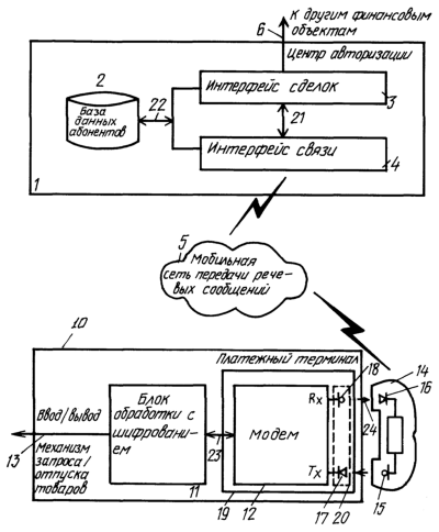 Центр 1 авторизации содержит интерфейс 4 связи для связи центра 1 авторизации с мобильной сетью 5 передачи речевых сообщений, базу 2 данных абонентов, в которой хранятся данные, относящиеся к каждому пользователю, например по меньшей мере телефонный номер, соответствующий персональный код пользователя и согласованный способ оплаты, например с кредитной карточки, с банковского счета и т.д., присвоенный каждому пользователю, и, дополнительно, исчерпывающая информация управления работой с клиентами, т.е. полная информация о покупках покупателя, обеспечивающая возможность персонализированных услуг, рекламы и т.д. и, также дополнительно, секретный код пользователя, и интерфейс 3 сделок, который соединяется при помощи соединения 6 для передачи данных с другой системой финансовой информации. Интерфейс 3 сделок соединен с интерфейсом 4 связи при помощи двунаправленного соединения 21 передачи данных. Далее, база 2 данных абонентов соединена с интерфейсом 3 сделок и с интерфейсом 4 связи при помощи линии 22 передачи данных.