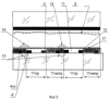 На фиг.3 схематически изображены смежные элементы отображения одного цвета вдоль управляющего электрода двух строк часть плазменной цветной панели переменного тока первого варианта с диэлектриком в виде полос.