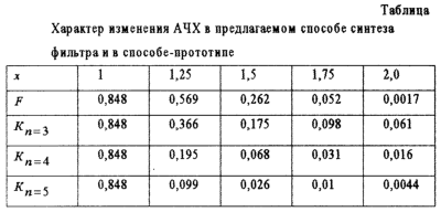 При этих условиях по выражениям (25) и (28) рассчитаны и сведены в таблицу значения АЧХ в предлагаемом способе синтеза и в способе-прототипе при относительном изменении частоты от х=1 до х=2. Причем при расчетах в прототипе использовались полиномы Чебышева 3-го, 4-го и 5-го порядков, имеющие следующие выражения:
