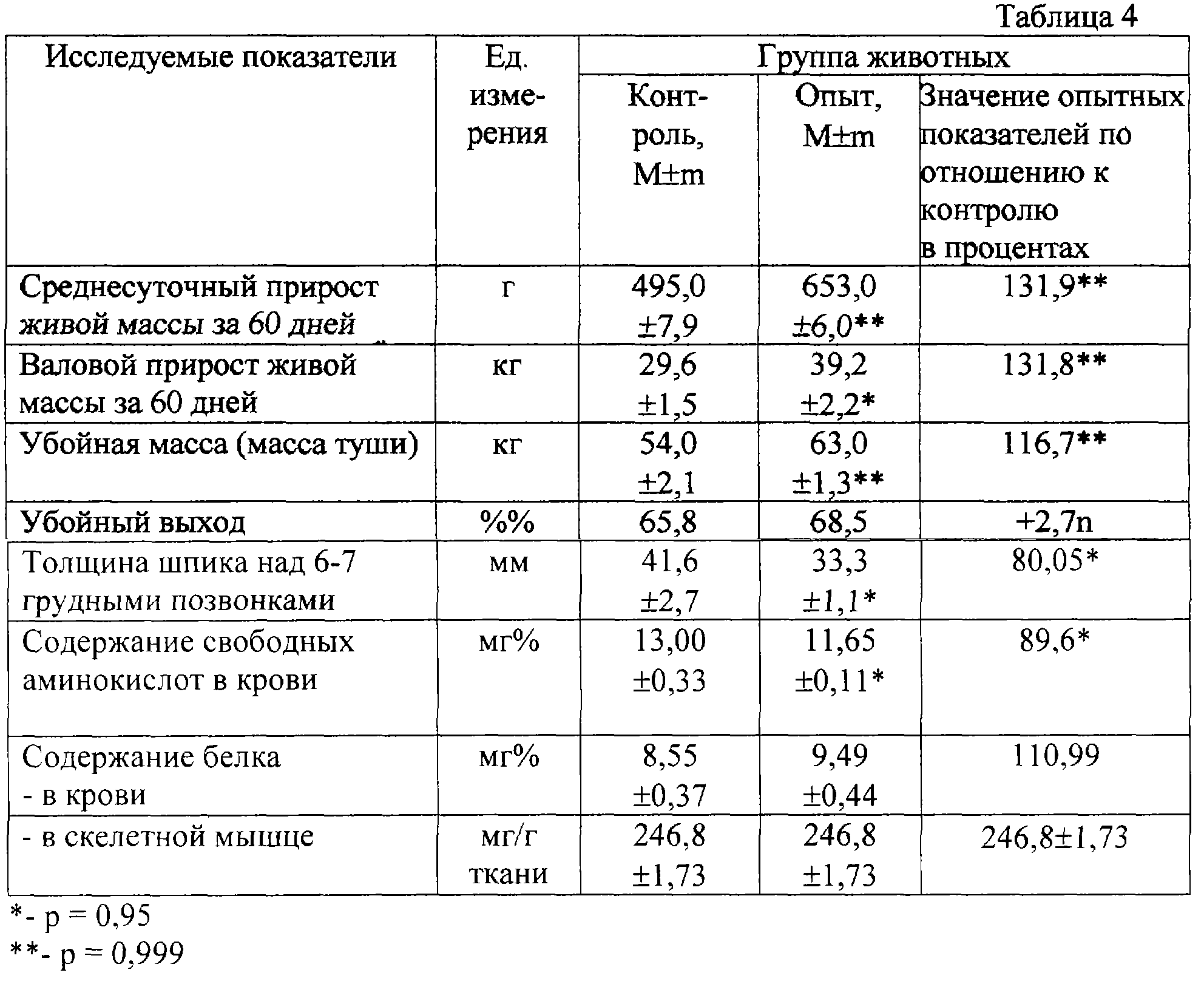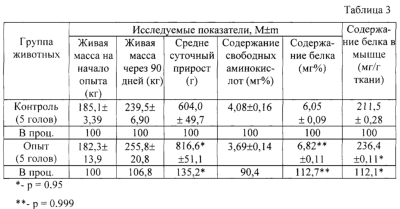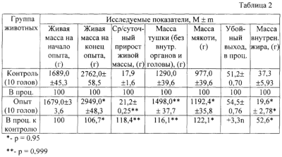 Изобретение относится к области сельского хозяйства и может быть использовано для повышения мясной продуктивности при откорме сельскохозяйственных животных. Современные технологии повышения продуктивности направлены на исследование механизмов, лежащих в основе прироста живой мышечной массы и поиск новых средств, позволяющих повысить убойный выход. Одним из наиболее перспективных направлений является использование бета 2-агонистов. По данным ряда авторов (Ф.Хухо. Модели рецептора. Нейрохимия. Основы и принципы. М. 1990. С.243; Lomo T.Motor innervation of muscle. London – New York – San Francisco. Аса. of Press. 1976. P.289; Pluskal V.G., Pennington R.J. Exper. Neurol. 1976. V.51. P.574) скелетная мышца является органом, функция которого полностью зависит от иннервации, нарушение или ослабление этой функции ведет к полной потере специфичности мышечных белков (как синтеза, так и деструкции). Такой процесс сопровождается усилением протеолиза и возникновением дефектов в различных системах регуляции белкового синтеза. Нарушение денервации мышц существенно снижает активность клеточных рибосом и уменьшает вес самой мышцы. Селективные бета 2-адреномиметики (бета 2-агонисты), возбуждая специфические бета-рецепторы, продуцируют на внутренней стороне мембраны “вторичный мессенжер” – циклические аденозиномонофосфат (АМФ) и гуаниномонофосфат (ГМФ), которые активируют клеточную протеинфосфокиназу, фермент, активирующий перенос фосфатных групп от АТФ на остатки серина и треонина белковых субстратов. Первичный ответ медиатора (при возбуждении бетаз-агонистом рецептора) открывает также ионный канал для кальция. Ионы кальция, инактивируя аденилатциклазу, способствуют концентрированию в клетке тех же циклических нуклеотидов – АМФ и ГМФ. Приведенные данные поясняют свойственный бета 2-агонистам механизм регулирующего влияния на белковосинтетические процессы в организме. Регистрировали увеличение среднесуточного прироста живой массы у опытных животных на 18 процентов выше контрольного прироста, снижение затрат корма на 1 кг прироста также на 18 процентов в сравнении с контролем (т.е. у животных, не получавших циметерол). Однако при использовании указанного средства отмечено увеличение жесткости мяса – усилие при разрезании в 3 раза выше, чем обычно. Отмечено ухудшение кулинарных свойств мяса. Нежелательным также является применение гормональных средств, которые оказывают побочное действие на самих животных и качество мяса. В качестве ближайшего аналога принято средство для повышения мясной продуктивности свиней – сальбутамол (Патент ФРГ №3721580, кл. МПК: А 23 К 1/22, 1989 г.), относящийся к группе бета 2-адреномиметиков. Сальбутамол применяют в качестве кормовой добавки в достаточно высоких дозах – до 50-100 мг на 1 кг живой массы. Для усиления эффекта его сочетают с антимикробными (гентамицин, биомицин) и стероидными средствами (преднизолон). Отмечено улучшение скорости роста, эффективность использования корма, увеличение количества постного мяса и снижение толщины шпика. Однако из-за низкой биодоступности препарат применяют в высоких дозах, что приводит к проявлению неизбежного побочного эффекта со стороны сердца и сосудов (тахикардия и повышение артериального давления). Одновременно снижается ростстимулирующая активность препарата. Недостатком известного средства является также необходимос