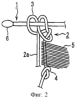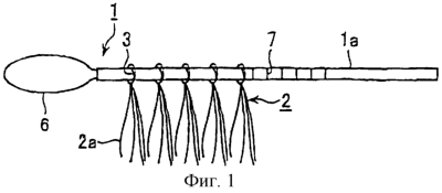 Устройство для восстановления волосяного покрова, изображенное на фиг.1, содержит несколько искусственных восстановителей 2 волос, свободно привязанных с определенным интервалом по внешней поверхности установочного стержня 1. Установочный стержень со стержневой частью 1а является инструментом для установки волос, представляющим собой пластмассовый элемент в виде соломинки или прутка. Восстанавливающие волосы 5 привязаны к стволовому волосу 2а, являющемуся частью искусственного восстановителя 2 волос, и закреплены на нем. Петля 3, образованная в изгибе стволового волоса 2, свободно привязана к установочному стержню 1. При варианте завязывания, показанном на фиг.2, петля 3 образована в витке одного стволового волоса 2а, а искусственный восстановитель 2 волос свободно привязан к установочному стержню 1, образуя вокруг него петлю. В данном случае для предотвращения спутывания расположенных с определенным интервалом завязываемых элементов на внешней поверхности стержневой части 1а установочного стержня 1 выполнены несколько канавок 7, которые препятствуют свободному перемещению свободно затянутых узлов в сторону. Этот установочный стержень 1 может быть выполнен в виде прутка, однако для более удобного применения лучше, если он является трубчатым.
