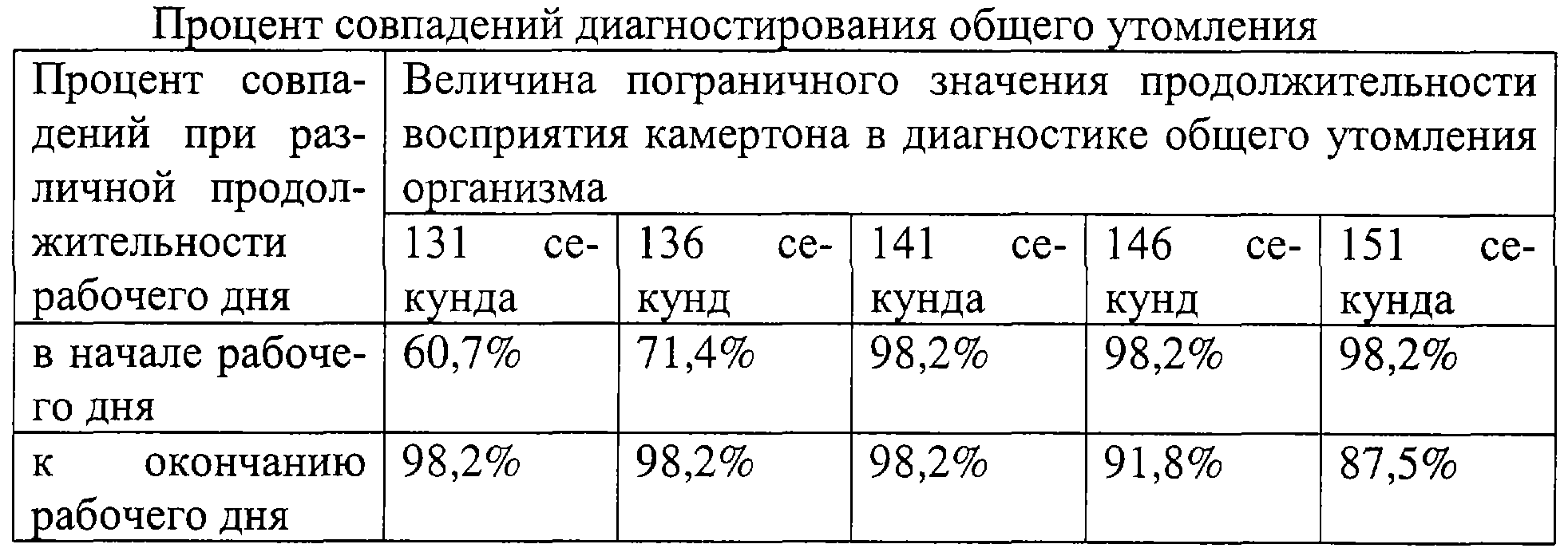 Изобретение относится к области медицины, а именно к функциональной диагностике, и может быть использовано в гигиене труда, функциональной диагностике, профессиональной патологии, физиологии, оториноларингологии. Известно достаточно большое количество методик и способов оценки функционального состояния организма человека: работоспособности, утомления /2/. Недостатками этих приемов оценки являются: необходимость соблюдения правил подготовки и проведения обследования, продолжительность процедуры регистрации первичных данных, дешифровки и оценки данных, необходимость аппаратного обеспечения методик, невозможность самообследования. В конечном итоге, все это делает выполняемое исследование достаточно оторванным от реальной ситуации и не соответствует одному из основополагающих принципов экспресс-диагностики “здесь и сейчас”. В качестве прототипа выбран “Способ диагностики утомления”, предполагающий исследование пороговой чувствительности сетчатки, исчисляемой в микроамперах (мкА) /1/. Суть способа заключается в том, что по результатам трехкратного исследования пороговой чувствительности сетчатки обоих глаз рассчитывают среднюю величину. Если среднее значение пороговой чувствительности сетчатки составляет 100 мкА и более, то диагностируют общее утомление организма. К недостаткам этого способа можно отнести следующие моменты: 1) необходимость аппаратного обеспечения способа в виде офтальмологического прибора для проведения электрофизиологического обследования зрительного анализатора; 2) необходимость выполнения обследования в затемненном помещении; 3) невозможность проведения самотестирования. Задача изобретения – разработать простой в оснащении и доступный в реализации способ диагностики общего утомления организма. Выполнение поставленной задачи осуществляют за счет того, что определяют продолжительность восприятия камертона с частотой звучания 128 герц (Гц) для каждого уха в секундах, производят сложение двух полученных величин, сравнивают суммарную величину продолжительности восприятия камертона со значением 141 с и диагностируют наличие утомления при суммарной продолжительности восприятия камертона 141 с и более. Способ осуществляют следующим образом. Объект исследования: личный состав караулов пожарных частей Государственной противопожарной службы (ГПС) МЧС России г. Красноярска. Выбор объекта исследования обусловлен тем, что личный состав караулов имеет 24-часовую продолжительность дежурства и наличие продолжительного дежурства приводит к возникновению общего утомления к окончанию рабочего дня. Обследование осуществляют дважды: в начале дежурства (1-2 часы рабочего дня) и к его окончанию (23-24 часы рабочего дня). Количество обследованных – 56 человек. Оценивают пороговую чувствительность сетчатки и продолжительность восприятия камертона с частотой звучания 128 герц (Гц) при воздушной проводимости звука. Чувствительность сетчатки диагностируют с помощью офтальмологического прибора “Диагност”, предназначенного для исследования периферического и проводникового отделов зрительного анализатора. Чувствительность сетчатки оценивают при частоте импульсов 6 Гц. Порогом чувствительности считают минимальное значение силы тока, вызывающей световые ощущения в глазном яблоке. Для камер