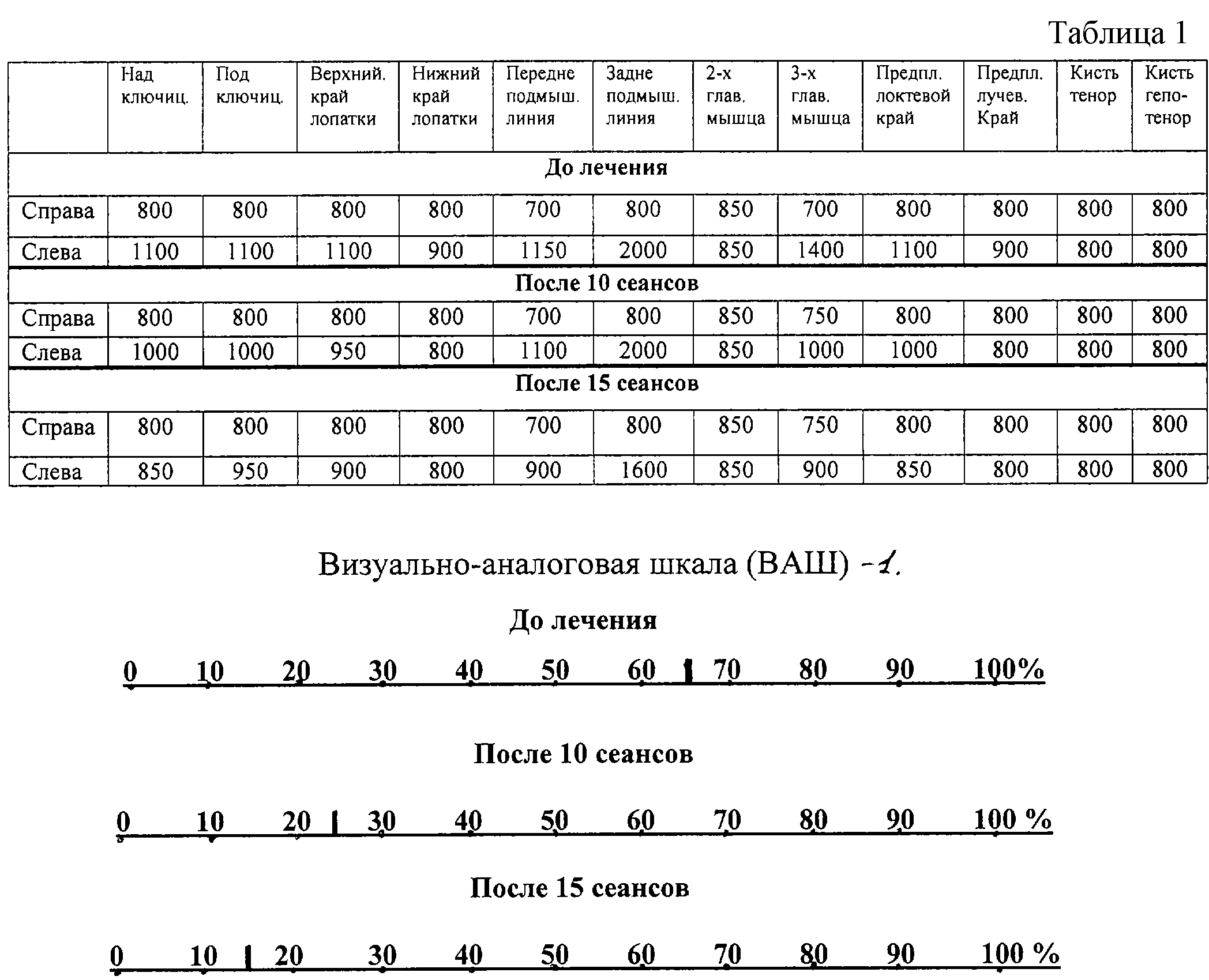 Пример 1. Больная К. 1948 г. рождения, диагноз: рак левой молочной железы Т3N0M0 Состояние после комбинированного лечения в 1999 г. брахиоплексопатия слева. Хронический болевой синдром в течение последних 2-х лет. Лимфостаз левой верхней конечности 1 ст. Получала комплекное лечение в виде магнитотерапии, иглорефлексотерапии, пневмомассажа, лекарственной терапии одновременно продолжительностью 15 сеансов. Показатели максимального порога болевой чувствительности (точки выбраны свободно) – табл.1, шкала 1.