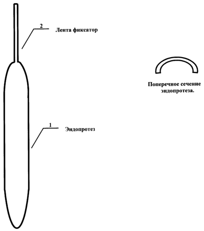 Способ осуществляют следующим образом. На чертеже изображен эндопротез – 1, который изготавливают индивидуально для каждого пациента из силиконовой трубки, диаметр которой соответствует возрастному диаметру пищевода, путем ее продольного рассечения и моделирования ленты – фиксатора – 2, шириной 0,3 см, являющейся монолитным продолжением эндопротеза. Длина эндопротеза от ленты – фиксатора до нижнего конца равна возрастной длине пищевода.