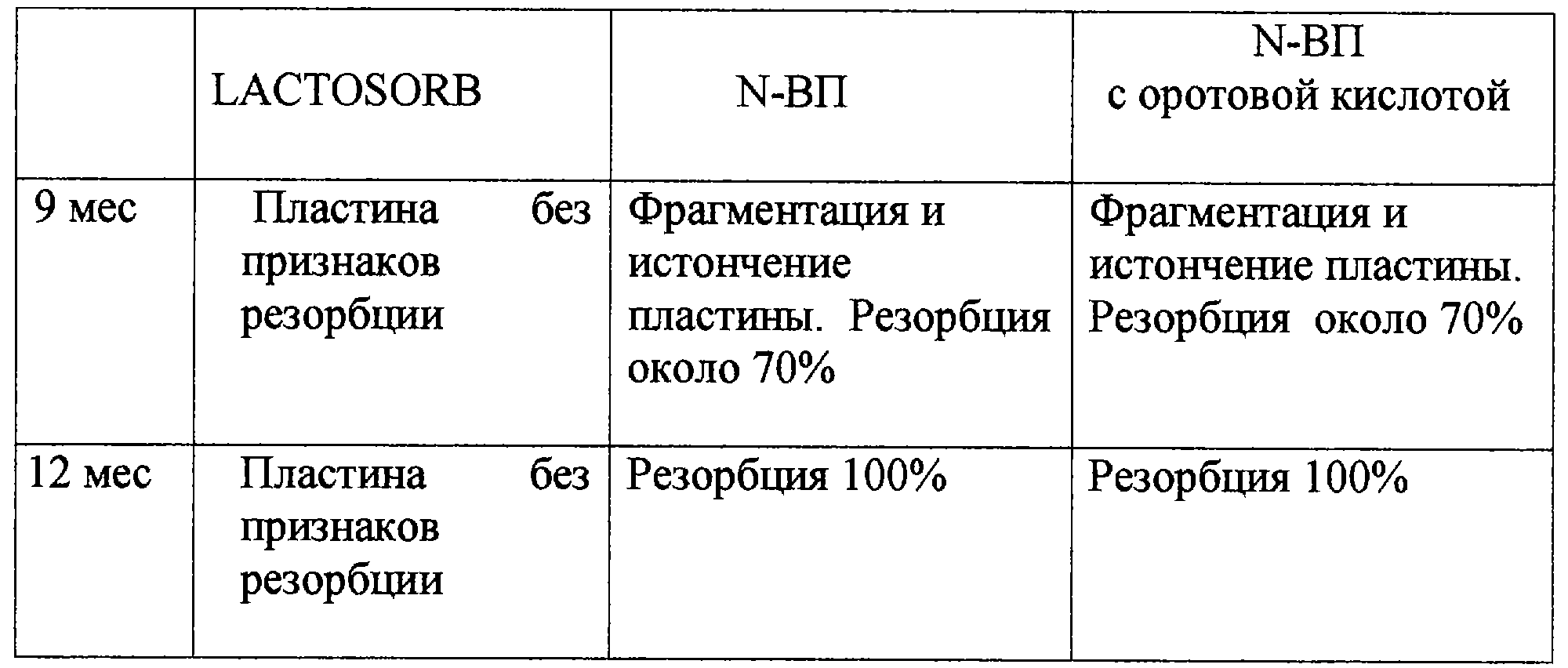 Изобретение относится к области медицины и может использоваться в челюстно-лицевой хирургии, травматологии и ортопедии. Известно применение металлических пластин для остеосинтеза при переломах челюстных костей, в частности, изготовленных из титана, которые требуют извлечения после заживления, что обуславливает необходимость дополнительного оперативного вмешательства, увеличение сроков лечения и потерю трудоспособности (Хирургическая стоматология: Учебник / Под ред. Т.Г.Робустовой. 2-е изд., перераб. и доп. – М.: Медицина, 1996. С.402-403). Известно также применение пластин для остеосинтеза, изготовленых из полилактидов и полигликолидов, в частности LACTOSORB (Eppley B.L. The Journal of Craniofacial Surgery, vol. 8, №2, march, 1997, p.85-86), которые подвергаются резорбции, что является положительным моментом, т.к. исключается второй этап операции – удаление пластины. Однако процесс резорбции пластины из полилактидов и полигликолидов занимает от 12 до 24 месяцев. Эти пластины выпускаются только толщины 1,5 и 2,0 мм. Пластины LACTOSORB, изготовленные из сополимера полимолочной и полигликолевой кислот в соотношении 82:18, выбраны в качестве прототипа. Задачей изобретения является сокращение сроков лечения переломов. Это достигается за счет того, что пластину изготавливают из N-винилпирролидона (N-ВП) толщиной 1-1,5 мм с добавлением препаратов, ускоряющих регенерацию и остеоинтеграцию костной ткани. N-ВП – синтезированный сополимер винилпирролидона с метилметакрилатом, армированный полиамидным волокном, ранее использовавшийся для фиксации костных отломков трубчатых костей конечностей в виде внутрикостных штифтов, а также в виде массы для устранения костных полостей (дефектов тела нижней челюсти и подбородочного отдела). Разрешен к применению приказами Минздрава за №1217 от 25.10.84 г., №386 от 20.03.86 г., №1027 от 06.08.86 г., №1025 от 05.08.86 г. и решением комиссии по общей хирургии (протокол №6 от 20.12.89 г.). При имплантации в биологические ткани штифты и масса подвергаются постепенному рассасыванию. За время использования зарекомендовал себя с наилучшей стороны. В эксперименте на животных (на 25 взрослых кроликах породы шиншилла) получены следующие результаты: 1 – по срокам резорбции 2 – по срокам заживления (см. таблицу). Появление в зоне повреждения клеточных элементов, свойственных нормальным твердым и мягким тканям, происходит быстрее у пластины из N-ВП, а значительнее N-ВП с оротовой кислотой. Кроме того, N-ВП в сравнении с LACTOSORB обладает регулируемым сроком резорбции за счет свойств N-ВП, толщины и включенных добавок, ускоряющих регенерацию и остеоинтеграцию, что имеет большое значение для определения сроков последующих этапов лечения (ортопедия, реабилитационные мероприятия). Сроки биодеструкции и прочность зависят от процентного содержания сополимеров и размеров пластины. Толщина пластины берется в пределах от 1 до 1.5 мм в зависимости от тяжести перелома. Пластина фиксируется к кости по стандартной методике.