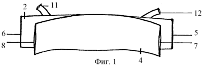 Конкретное описание работы устройства. Подготавливают устройство к использованию так. В прорезь 13 чехла вводят пояс поясничный, проводя борта его к отверстиям 5 и 6 чехла. Ремешки пояса вводят через отверстия в местах прикрепления 9 и 10 в рукава 11 и 12. Эластичные тяжи пояса вводят через прорезь 14 и проводят через отверстия в концах 7 и 8 муфты. Пристегивают застежку 17 муфты к застежке 15 чехла, а застежки 18 муфты к застежке 16 чехла. Устройство готово к применению. Приложив внутреннюю поверхность 1 чехла к пояснице, выведенные из рукавов 11 и 12 концы ремешков укладывают на живот и с некоторым натяжением застегивают ремешки для удержания пояса. Выведенные из отверстий 5 и 6 концы бортов пояса с необходимым натяжением скрепляют между собой застежками на животе над рукавами 11 и 12 и находящимися в них ремешками. Выведенные из отверстий 7 и 8 концы тяжей пояса с усиливающим должным натяжением скрепляют между собой застежками на животе над тыльной поверхностью 2 чехла.