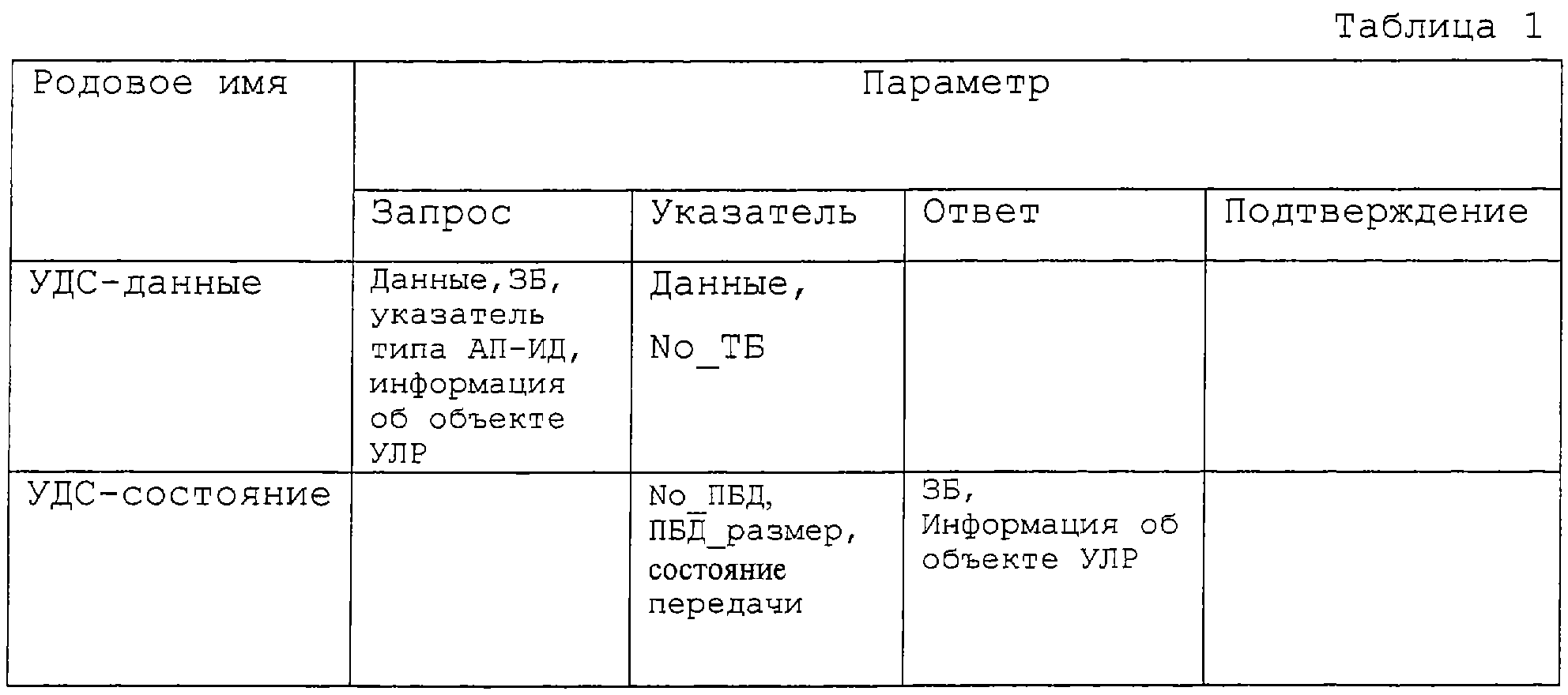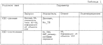 Таблица 1 иллюстрирует примитивы, определенные для передачи данных и управляющей информации между УЛР и УДС в обычной системе связи Ш-МДКР, не поддерживающей ВСПДН. В Таблице 1 примитив УДС-данные – примитив для обмена данными между УЛР и УДС – включает в себя поле “Запроса” для передачи данных из УЛР в УДС и поле “Указателя” для передачи данных из УДС в УЛР. Далее поле “Запроса” для УДС-данные может включать информацию о занятости буфера (ВО, ЗБ), указывающую на заполненный объем буфера УЛР после передачи данных, информацию о типе АП-ИД и информацию об объекте УЛР для выбора КТФ, а поле “Указатель” может включать информацию по числу No_TB транспортных блоков (ТВ, ТБ) передаваемых данных. В варианте настоящего изобретения осуществляется сообщение о событии возврата УЛР в исходное состояние, используя примитив УДС-данные в системе связи, использующей ВСПДН.