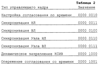 Обратимся к фиг.10, для того чтобы передать информацию о возврате УЛР в исходное состояние из УЛР СКР в УДС Узла В, в варианте настоящего изобретения используется управляющий кадр, созданный путем модификации управляющего кадра для обычной системы связи Ш-МКДР, не использующей ВСПДН. Как показано на фиг. 10, управляющий кадр для передачи информации о возврате УЛР в исходное состояние состоит из 2-байтового заголовка 1010 и полезной нагрузки 1050 переменной длины. Заголовок 1010 состоит из поля 1011 контроля циклическим избыточным кодом (CRC, ЦИК) Кадра, поля 1013 Типа Кадра (FT, TK) и поля 1015 Типа Управляющего Кадра. В обычном управляющем кадре для обычной системы связи Ш-МКДР, не использующей ВСПДН, существует множество типов управляющего кадра по кадровому протоколу, как показано ниже в Таблице 2. Поэтому управляющий кадр для возврата УДС-вс в исходное состояние, обусловленного возвратом в исходное состояние УЛР, т.е. управляющий кадр для передачи информации о возврате УДС-вс в исходное состояние из-за возврата УЛР в исходное состояние, согласно варианту настоящего изобретения осуществляется путем выбора одного из типов управляющего кадра, показанных в Таблице 2, и модификации выбранного типа управляющего кадра. Вместо передачи информации о возврате УДС-вс в исходное состояние при возврате в исходное состояние УЛР путем модификации одного из типов управляющего кадра можно сформировать управляющий кадр для возврата УДС-вс в исходное состояние путем закрепления за новым типом управляющего кадра “Возврат в исходное состояние УДС-вс ” значения “0000 1011”.