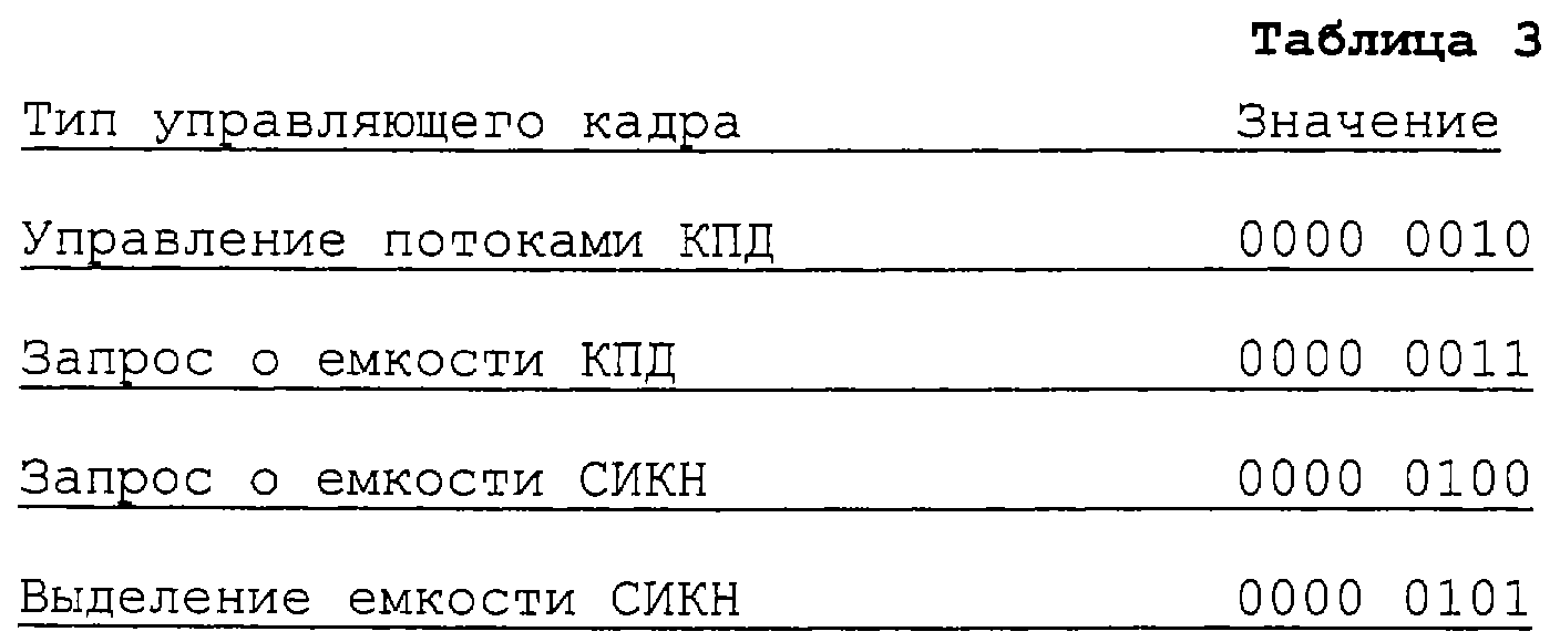 Кроме того, когда АП, принимающий услугу ВСПДН, находится в зоне передачи обслуживания, то требуется, чтобы информация о возврате УЛР в исходное состояние была передана из управляющего СКР (CRNC, УСКР) ВС-СИКН в другой СКР. В этом случае также управляющий кадр, показанный на фиг.10, существует между СКР, к которому в текущий момент принадлежит АП, и другим СКР, в который должно быть передано обслуживание АП, а тип управляющего кадра показан ниже в Таблице 3. Здесь управляющий кадр передается через интерфейс Iur между СКР, к которому АП в текущий момент принадлежит, и другим СКР, в который должно быть передано обслуживание АП. В этом случае также управляющий кадр для возврата УДС-вс в исходное состояние из-за возврата в исходное состояние УЛР может быть осуществлен путем модификации одного типа управляющего кадра, выбранного из типов, показанных в Таблице 3. Вместо передачи информации о возврате УДС-вс в исходное состояние из-за возврата в исходное состояние УЛР путем модификации одного из существующих типов управляющего кадра можно сформировать управляющий кадр путем закрепления за новым типом управляющего кадра “Возврат в исходное состояние УДС-вс ” значения “0000 0111”. Кроме того, структура полезной нагрузки управляющего кадра также осуществляется таким же образом, как описано было в связи с фиг.10.