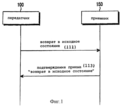 Фиг.1 иллюстрирует процесс установки в исходное состояние УЛР, работающего в РПП. Для установки в исходное состояние УЛР, работающего в РПП, указатели номера гиперкадра (HFNI, УНГК) одноранговых УЛР, т.е. УЛР УНГК наземной сети доступа к радиосвязи TRAN, НСДР универсальной системы мобильной электросвязи (UMTS, УСМС) (UTRAN, УНСДР) и УЛР АП, синхронизируются друг с другом, а после синхронизации все блоки данных отбрасываются. Процедура возврата УЛР в исходное состояние начинается в состоянии “ошибка протокола” и после определения, что УЛР возвратился в исходное состояние, УЛР 100 передатчика передает протокольный блок данных (ПБД) “Возврат в исходное состояние” в одноранговый УЛР, т.е. УЛР 150 приемника (операция 111). При приеме ПБД “Возврат в исходное состояние” УЛР 150 приемника возвращает в исходное состояние УЛР, изменяемое до начального значения, и отбрасывает все принятые ПБД. После выполнения процесса возврата УЛР в исходное состояние УЛР 150 приемника передает ПБД “ПП Возврата в исходное состояние” в УЛР 100 передатчика и заканчивает процесс (операция 113) возврата УЛР в исходное состояние.