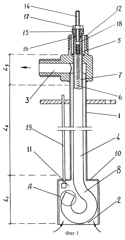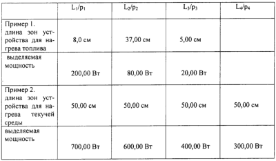 Вся длина трубчатого нагревателя 4 разделена на три зоны L1, L2, L3, как показано на фиг.1, которые имеют разные удельные мощности. Максимальная мощность трубчатого электронагревателя Р=2 кВт при Umax=28 В. Длины отдельных участков тэн’а и соответствующие рассеиваемые мощности показаны в таблице.