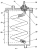 Пример 2. Устройство для нагрева текучей среды содержит корпус 20 для жидкости с отверстиями для подачи 21 и отвода 22 среды. На крышке 23 корпуса 20 на установочном фланце 24 смонтирован трубчатый электронагреватель 26 с помощью штуцера 27 и гайки 28. Корпус 29 трубчатого электронагревателя 26 выполнен в виде спирали, погруженной в жидкость. Токоввод 30 и следовательно один конец спирали 31 соединены с фазой, а второй конец спирали присоединен к корпусу так, как показано на фиг.3, и, следовательно, как и трубчатый корпус 29 соединен с массой корпуса 20. Все витки спирали имеют равную длину, однако разную выделяющуюся на каждом витке мощность, как показано в таблице.
