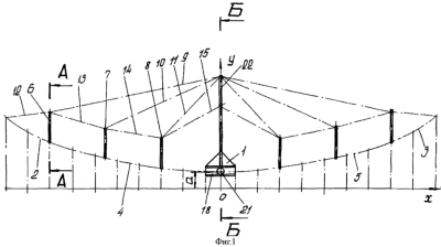 При таком конструктивном исполнении силы натяжения канатов гибких поясов 9,10 и 11 и в раскосах 12-15 минимальны. Этим достигается существенное снижение материалоемкости конструкции фермы двухконсольного дождевального агрегата.