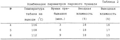 При способе обработки табака, в частности табака Берли, табак, предпочтительно в виде листового табака, подвергается соусированию, которое предпочтительно содержит сахар. Затем следует термическая обработка подвергшегося соусированию табака насыщенным паром, причем перед обработкой паром влажность табака лежит в интервале от 15 до 25% и причем после обработки паром влажность табака лежит в интервале от 15 до 25%, а температура табака – в интервале от 80 до 115°C. Технический результат – однородное качество продукта при сокращении числа стадий процесса и уменьшении затрат энергии. 6 з.п. ф-лы, 4 табл.