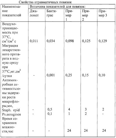 Изобретение относится к производству медицинских изделий, в частности атравматичных первично контактирующих с раной средств. Атравматическая повязка включает волокнистый материал, представляющий собой полотно трикотажного плетения с размером ячейки (1,5-2,5)x(1,5-2,5) мм и высотой 0,6-0,9 мм из отбеленных хлопковых волокон, пропитанные композицией, включающей парафин, с плотностью 780-830 г/м3, воду и лекарственный препарат. Повязка улучшает дренирующие свойства и экстракцию гидрофильных лекарственных препаратов в раневую полость с созданием влажной раневой среды. 1 табл.