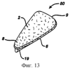 Специалисту в данной области техники очевидно, что можно использовать сочетания профилей для ширины и длины, чтобы получить оптимальную защиту с достижением удобства и удержания средства между губами. Профиль проксимальной части 2 может быть различным, чтобы обеспечить больший или меньший контакт с женскими половыми органами для достижения баланса между удобством и хорошим контактом, а также размещение, способствующее эффективному захвату жидкости. На фиг.11 и 12 показаны перспективные изображения изделий 70 и 75 с примерами таких профилей, в которых канавки 22 на проксимальной части 2 ограничивают соприкосновение с женскими половыми органами и в то же самое время обеспечивают хорошую способность к захвату жидкости и предотвращают обход жидкостью абсорбирующего изделия. На фиг.13 показано абсорбирующее изделие 80, имеющее плоскую проксимальную часть 2 для того, чтобы обеспечить большую площадь поверхности приема жидкости, особенно на заднем конце 9, предназначенном для расположения вблизи влагалищного отверстия пользователя, без образования неудобного объема на переднем конце 8, предназначенном для расположения вблизи отверстия мочеиспускательного канала пользователя.