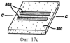 На фиг.17a-17f показаны стадии, содержащиеся в предпочтительном способе изготовления согласно изобретению прилипающего к телу, абсорбирующего межгубного изделия. На фиг.17а изображен отрезок абсорбирующей ткани 200 совместно с необязательным, проницаемым для жидкости покровным материалом 201 и необязательным клеевым средством 202 для обеспечения устойчивости тканевого выступа, образованного путем складывания ткани. Абсорбирующую ткань 200 складывают вдоль центральной оси В-В симметрии ткани, показанной на фиг.17а, чтобы образовать тканевую структуру 210, показанную на фиг.17b, имеющую тканевый выступ 203 и тканевые базовые части 204. Затем аналогичные стадии складывания повторяют в отношении непроницаемого для жидкости материала, при этом непроницаемый для жидкости материал является, предпочтительно, газопроницаемым, действующим как барьер, чтобы предотвратить пачкание жидкостью тела или белья пользователя. На фиг.17с показан отрезок непроницаемого для жидкости материала 300 совместно с необязательным клеевым средством 302 для обеспечения устойчивости непроницаемого для жидкости выступа, образованного путем складывания непроницаемого для жидкости материала. Непроницаемый для жидкости материал 300 складывают вдоль центральной оси С-С симметрии непроницаемого для жидкости материала, показанной на фиг.17с, чтобы образовать непроницаемую для жидкости структуру 310, показанную на фиг.17d, имеющую непроницаемый для жидкости выступ 303 и непроницаемые для жидкости базовые части 304. Далее тканевую структуру 210 и непроницаемую для жидкости структуру 310 прикрепляют друг к другу. На фиг.17е изображены тканевая структура 210 и непроницаемая для жидкости структура 310, пространственно совмещенные и прикрепленные, при этом тканевый выступ 203 и непроницаемый для жидкости выступ 303 развернуты наружу в противоположных направлениях относительно друг друга. Клей для приклеивания к телу может быть нанесен, что необязательно, на часть тканевой структуры.