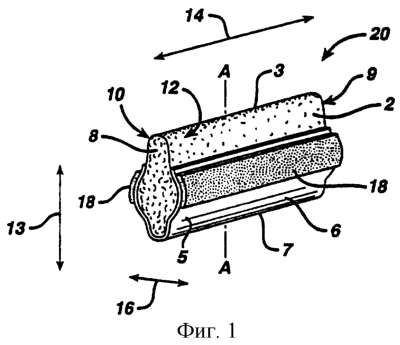 Нижеследующее представляет собой подробное описание изобретения, показанного на фигурах. На фиг.1 представлено перспективное изображение первого варианта осуществления абсорбирующего изделия 20 этого изобретения, и этот вариант осуществления может иметь, что необязательно, непроницаемый для жидкости барьер 5, полезный для предотвращения утечки жидкости из абсорбирующего изделия 20 на одежду пользователя. Абсорбирующее изделие 20 включает в себя абсорбирующий материал и содержит проксимальную часть 2, имеющую наружную кромку 3, которая дальше всего проникает в пространство, по меньшей мере, между большими губами, дистальную часть 6, которая имеет наружную кромку 7 и расположена противоположно проксимальной части 2, передний конец 8, который обращен к клитору, но, предпочтительно, не соприкасается с ним при использовании, задний конец 9, который обращен к задней уздечке половых губ, но, предпочтительно, не соприкасается с ней, две противоположные боковые поверхности 10, 12, расположенные между наружными кромками 3 и 7, высота 13 которых определяет степень проникновения внутрь губ, длина 14 которых обеспечивает покрытие влагалищного отверстия и/или отверстия мочеиспускательного канала, и ширина 16 которых обеспечивает надежное размещение внутри пространства между губами и обеспечивает хороший контакт с, по меньшей мере, дистальными участками больших губ. Существенно, что абсорбирующее изделие 20 также содержит клей 18, предпочтительно – клей, приклеивающийся к телу, для прикрепления абсорбирующего изделия 20 к телу, в данном случае к большим губам и/или к вульве. Линия А-А, также изображенная на фиг.1, представляет собой линию для получения поперечных сечений, показанных на фиг.7-10.