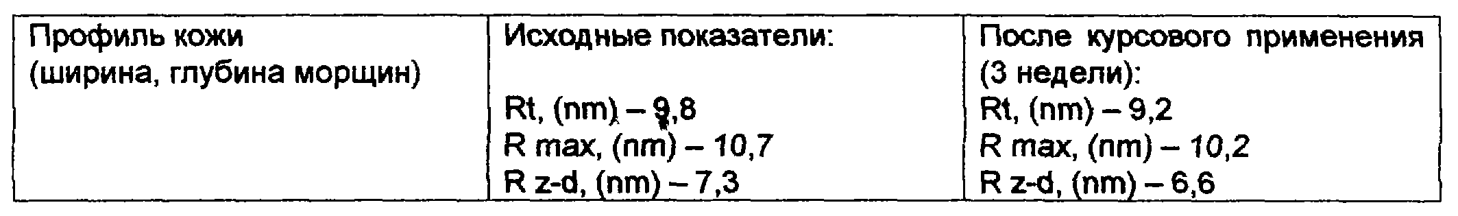 Изобретение относится к косметологии и касается средств для ухода за кожей. Лифтинг-крем для сухой и чувствительной кожи содержит структурообразующие эмульгаторы, эмоленты, циклометикон, увлажняющие добавки – глицерин или пропиленгликоль, масляную фазу, биологически активные добавки, пигменты, эфиры метиловый и пропиловый параоксибензойной кислоты или Катон CG, или Гермабен II, или бронитрол или бронопол, парфюмерную композицию и воду, отличается тем, что дополнительно содержит желирующие агенты – карбомеры или карбопол и нейтрализующие агенты – триэтаноламин или натрия гидроокись, или натр едкий технический, УФ-фильтры – смесь октилметоксициннамата, бутилметоксидибензоил-метана, октилсалицилата в соотношении 1:1:1 или смесь октилметоксициннамата и бутилметоксидибензоилметана в соотношении 1:1, трилон Б, в качестве структурообразующих эмульгаторов содержит смесь ПЭГ-100 стеарат и моностеарата глицерина в соотношении 1:1, спирты высокомолекулярные синтетические С16-С18, или спирты синтетические первичные жирные фракции С16-С20, глицерилолеат, полисорбат-60, стеарин косметический, в качестве эмолентов – октилдодеканол, октилстеарат, дикаприловый эфир, пентаэритритил тетраизостеарат, в качестве увлажняющей добавки дополнительно содержит аллантоин, в качестве масляной фазы – изопропилпальмитат или изопропилмиристат, в качестве биологически активных добавок содержит масло какао, масло ши, масло авокадо, масло персиковое, экстракт цветков ромашки водно-спиртовый или экстракт из цветков ромашки водно-спирто-глицериновый, или экстракт из цветков ромашки в пропиленгликоле, гидролизованный соевый протеин, экстракт планктона, витамин Е, фитостерола сульфат, в качестве пигментов – алюминий крахмал октенилсукцинат. Лифтинг-крем “Диамант” для сухой и чувствительной кожи разглаживает сеть мелких морщин и корректирует контуры лица в процессе непрерывного увлажнения и продолжительной защиты от УФ-излучения. Об этом свидетельствует уплощение изученных зубцов мелких морщин в среднем: Rt ср. на 6,5%, R max ср. на 5,0%, R z-d ср. на 10,6%. 1 табл.