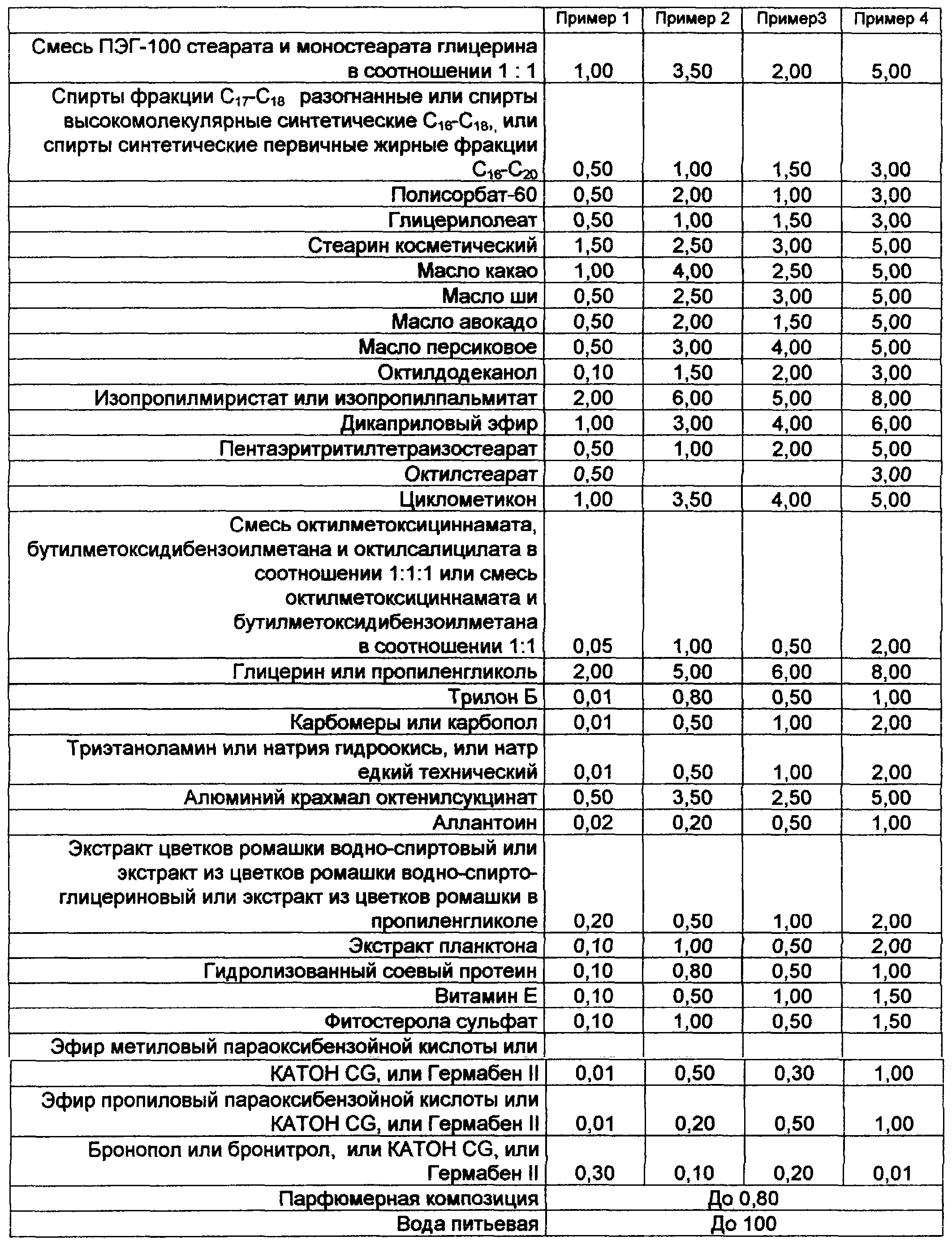 Лифтинг-крем для сухой и чувствительной кожи, содержащий структурообразующие эмульгаторы, эмоленты, пленкообразующие – циклометикон, увлажняющие добавки – глицерин или пропиленгликоль, масляную фазу, биологически активные добавки, пигменты, эфиры метиловый и пропиловый параоксибензойной кислоты, парфюмерную композицию и воду, отличающийся тем, что дополнительно содержит желирующие агенты – карбомеры или карбопол и нейтрализующие агенты – триэтаноламин, или натрия гидроокись, или натр едкий технический, УФ-фильтры – смесь октилметоксициннамата, бутилметоксидибензоилметана и октилсалицилата в соотношении 1:1:1 или смесь октилметоксициннамата и бутилметоксидибензоилметана в соотношении 1:1, трилон Б, в качестве структурообразующих эмульгаторов содержит смесь ПЭГ-100 стеарата и моностеарата глицерина в соотношении 1:1, спирты высокомолекулярные синтетические C16-C18, или спирты синтетические первичные жирные фракции C16-C20, глицерилолеат, полисорбат-60, стеарин косметический, в качестве эмолентов – октилдодеканол, октилстеарат, дикаприловый эфир, пентаэритритил тетраизостеарат, в качестве увлажняющей добавки дополнительно содержит аллантоин, консерванты – катон CG, или Гермабен II, или бронитрол, или бронопол, в качестве масляной фазы – изопропилпальмитат или изопропилмиристат, в качестве биологически активных добавок содержит масло какао, масло ши, масло авокадо, масло персиковое, экстракт цветков ромашки водно-спиртовый или экстракт из цветков ромашки водно-спирто-глицериновый, или экстракт из цветков ромашки в пропиленгликоле, гидролизованный соевый протеин, экстракт планктона, витамин Е, фитостерола сульфат, в качестве пигментов – алюминий крахмал октенилсукцинат при следующем соотношении компонентов, мас.%: Смесь ПЭГ-100 стеарата и моностеарата глицерина в соотношении 1:1 1,00-5,00 Спирты фракции C17-C18 разогнанные, или спирты высокомолекулярные синтетические C16-C18, или спирты синтетические первичные жирные фракции C16-C20 0,50-3,00 Полисорбат-60 0,50-3,00 Глицерилолеат 0,50-3,00 Стеарин косметический 1,50-5,00 Масло какао 1,00-5,00 Масло ши 0,50-5,00 Масло авокадо 0,50-5,00 Масло персиковое 0,50-5,00 Октилдодеканол 0,10-3,00 Изопропилмиристат или изопропил- пальмитат 2,00-8,00 Дикаприловый эфир 1,00-6,00 Пентаэритритилтетраизостеарат 0,50-5,00 Октилстеарат 0,50-3,00 Циклометикон 1,00-5,00 УФ-фильтры – Смесь октилметоксициннамата, бутилметоксидибензоилметана и октилсалицилата в соотношении 1:1:1 или смесь октилметоксициннамата и бутил- метоксидибинзоилметана в соот- ношении 1:1 0,05-2,00 Глицерин или пропиленгликоль 2,00-8,00 Трилон Б 0,01-1,00 Карбомеры или карбопол 0,01-2,00 Триэтаноламин, или натрия гидроокись, или натр едкий технический 0,01-2,00 Алюминий крахмал октенилсукцинат 0,50-5,00 Аллантоин 0,02-1,00 Экстракт цветков ромашки водно-спиртовый, или экстракт из цветков ромашки водно- спирто-глицериновый, или экстракт из цветков ромашки в пропиленгликоле 0,20-2,00 Экстракт планктона 0,10-2,00 Гидролизованный соевый протеин 0,10-1,00 Витамин Е 0,10-1,50 Фитостерола сульфат 0,10-1,50 Эфир метиловый параоксибензойной кислоты, или КАТОН CG, или Гермабен II 0,01-1,00 Эфир пропиловый параоксибензойной кислоты, или КАТОН CG, или Гермабен II 0,01-1,00 Бронопол, или бронитрол, или КАТОН CG, или Гермабен II 0,01-0,30 Парфюмерная композиция до 0,80 Вода питьевая До 100