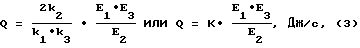 Поток нагретого (или охлаждаемого) теплоносителя из канала 1 разделяется надвое и поступает в оба ответвления 2 и 3, причем расходы G2 и G3 равны, поскольку условия протекания одинаковы. В случае неизменной температуры теплоносителя t = Const температура на выходе ответвления 2 будет практически равна температуре входа, так как оно теплоизолировано со всех сторон. При этом в ответвлении 3 теплоноситель отдает (или принимает) часть тепловой энергии q через радиатор, а его средняя температура, как и в прототипе, изменяется на t Поскольку массовый расход определяется зависимостью G3 = q/cp![]() t, то, измеряя величины g и t, можно определить расход следующим образом. По характеристикам датчиков имеем:E1 = k1 q (для датчика 4),E1 = k2 ![]() t (для датчика 6),где k1 и k2 – коэффициенты преобразования датчиков. Отсюда следует q = E1/k1; t = E1/k2Подставляя эти величины в формулу расхода, получаем ![]() Поскольку расход измеряется только в одном ответвлении 3, то общий расход G, будет равен сумме расходов: ![]() Известно, что количество теплоты, передаваемой объекту теплопотребления в единицу времени, равно Q = cp G![]() T, где T – разность температур теплоносителя до и после объекта теплопотребления. При применении дифференциального способа измерения температур получим сигнал E3 = k3![]() T, то есть T = E3/k3. Следовательно, с учетом (1)и (2) получим, что![]() где ![]() По этому алгоритму блок 9 вычислит тепловую мощность, а количество тепла определит интегрированием за время = 2– 1.Разность температур t = t1-t2 можно представить и по другому, так как она является функцией f(q, G, Ср, F), где F – площадь теплообмена. То есть t1 – t2 = f(q, G, Cр, F). Отсюда t2= t1-f(q, G, Cp, F). Затем представим разность температур между выходами ответвлений в виде:![]() где t’2 – на выходе 2, а t2 – на выходе 3. При t1 = Const t’2 = t1, поскольку в ответвлении 2 нет теплообмена. Поэтому имеем: ![]() В случае же изменения температуры на входе t1 = f1( ) появляется зависимость t’2 от времени и конструкции ответвления, а именно![]() где Сn – теплоемкость каждой из n частей с учетом ее температуропроводности аi и геометрии. При этом ![]() поскольку добавляется влияние теплообмена. Вычитая t2 из t’2, получим t = f(q,G,cp,F),так как ![]() по условию. To есть сигнал датчика будет такой же, как и при t1 = Const, независимо от изменений температуры на входе. Это значит, что ответвление 2 компенсирует всегда возможное на практике влияние дрейфа температуры теплоносителя. Предлагаемый теплосчетчик-расходомер может быть использован как надежный и сравнительно недорогой прибор по учету тепловой энергии. Кроме того, он может быть применен просто как расходомер нагретых (или охлажденных) жидких или газообразных сред с учетом их удельной теплоемкости и инерционности самого прибора. Формула изобретения
