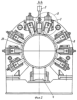 Механизм регулировки перемещения каждой роликовой кассеты в радиальном направлении выполнен в виде кинематической пары винт 10 – гайка 11 и приводного зубчатого зацепления, ведомое колесо 12 которого насажено на гайку 11, смонтированных в корпусе 13, установленном на кронштейне 14. На пальце 15, закрепленном на кронштейне 14, шарнирно установлен корпус 16 роликовой кассеты 7, 8, 9.