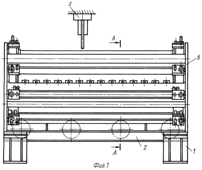 Для поворота роликовой кассеты 7, 8, 9 относительно кронштейна, например поворот верхней роликовой кассеты 7 на угол , на торце корпуса 16 роликовой кассеты шарнирно смонтирована тяга 22, связанная с тягой 23, шарнирно закрепленной на кронштейне 14, а тяги между собой связаны гайкой 24, в которой выполнена левая и правая резьба.