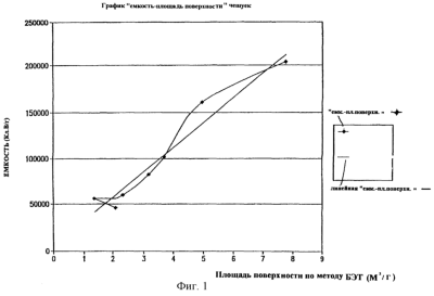На фиг.1 представлен график, показывающий площадь поверхности по методу БЭТ порошков ниобия и их соответствующую емкость после формования в аноды и спекания при температуре 1150 или 1300°С.