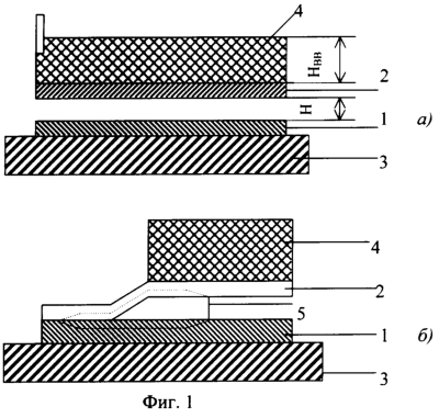 Предлагаемый способ реализуют следующим образом. Предварительно производят отработку свариваемых поверхностей пластин 1 и 2 до шероховатости Rz=8.0÷12,0, затем свариваемые пластины 1 и 2 устанавливают на стальную опору 3 для обеспечения сохранности готового изделия. Между пластинами выставляют зазор Н (фиг.1а), необходимый для создания условий возникновения воздушной ударной волны. Заряд ВВ 4 устанавливают на горизонтальную поверхность метаемой пластины 2. Толщину заряда Нвв выбирают из условий обеспечения времени действия давления, достаточного для остывания расплавленных слоев.