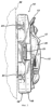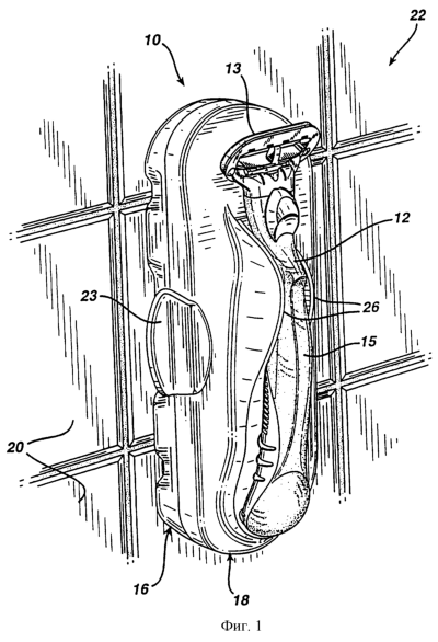 Ссылаясь на фиг.6 и 7, крышка 18 имеет опорные поверхности 60, 62, стремящиеся соответствовать задней поверхности ручки 15, которая выполнена для использования женщинами при бритье подмышек и ног. Эта ручка показана в Патенте США №407851 на промышленный образец, который включен сюда посредством ссылки. Нижняя часть ручки 15 зацепляется и поддерживается отверстием 28, а верхний участок ручки 15 расположен в промежутке между створками 26 и снаружи от поддерживающей поверхности 62 и зацепляется створками 26. Плоский участок 64 выполнен на верхнем конце крышки 18, чтобы образовать промежуток для лезвийного узла прикрепленного бритвенного сменного блока 13. Задняя поверхность ручки 15 полностью соответствует и подобна наружной поверхности крышки 18. Пользователь захватывает стороны ручки 15, когда не имеется достаточного пространства для пальцев пользователя, чтобы захватить заднюю поверхность ручки 15.