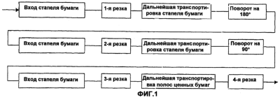 Сначала следует описать способ резки со ссылкой на фиг.1. На первом этапе способа согласно изобретению стопы листов направляют под первый нож машины и там разрезают первую свободную полосу стопы листов. Эта свободная полоса лежит между краем уложенных в стопы листов и рядами, т.е. строками или столбцами, оттисков ценных бумаг. Свободная полоса образует свободное пространство, которое обеспечивает, в частности, захват отдельных листов зажимами без опасности повреждения оттисков. На первой операции разрезают эту первую свободную полосу (“резка 1” на фиг.1), а именно перпендикулярно направлению движения стопы листов. После первой резки листы с помощью подходящих транспортных устройств перемещают назад на поворотную тарелку, которая сама по себе известна из уровня техники, и стопу листов поворачивают на поворотной тарелке на 180°. Стопы листов затем снова направляют под первый нож и параллельно вышеназванной первой свободной полосе выполняют вторую операцию резки второй свободной полосы (“резка 2” на фиг.1). После этого второго процесса резки стопу листов снова перемещают назад на поворотную тарелку и поворачивают еще на 90°. Стопу листов затем снова направляют под первый нож и перпендикулярно обеим первым полосам, которые уже были разрезаны, выполняют третью операцию резки третьей свободной полосы (“резка 3” на фиг.1). Не поворачивая дальше стопу листов, теперь уложенные в стопы листы ценных бумаг можно разрезать первым ножом на последовательные параллельные стопы полос, причем каждую стопу каждый раз продвигают на ширину полосы. Эта операция резки на последовательные полосы изображена на фиг.1 всегда блоком “резка 3”, поскольку ее выполняют первым ножом после резки третьей свободной полосы.