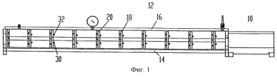 На чертежах показаны части экструзионной установки, с помощью которой изготавливаются состоящие из пластмассы профили необходимой геометрической формы, например полые профили, трубы или другие длинномерные элементы с необходимой геометрической формой поперечного сечения. При этом выходящий из непоказанного на чертеже сопла экструдера пластический профиль может вначале подаваться в сушильное калибрирующее устройство 10, например вакуумное калибрующее устройство, в котором осуществляется вакуумное калибрование посредством техники распыления (устройство 12). Устройство 12 содержит вытянутый корпус, например ванну 14, закрываемую крышкой 16. Внутри ванны 14 установлены с заданным шагом перегородки 18, 20, которые со своей стороны имеют проходные отверстия, геометрическая форма которых соответствует наружному контуру охлаждаемого и калибруемого профиля. При этом можно сослаться на уже известные технические решения. Перегородки 20 установлены, в частности, плавающими, причем перегородки 18, 20 в направлении транспортировки (стрелка 22) профиля прилегают к опорным планкам 28a, 28b, выходящим от противолежащих боковых стенок 24, 26 ванны 14. На противолежащей стороне перегородки 18, 20 предусмотрены пальцеобразные фиксирующие элементы 30, 32. Вместо опорных планок и фиксирующих элементов в стенках 24, 26 можно также выполнить канавки для ввода перегородок.