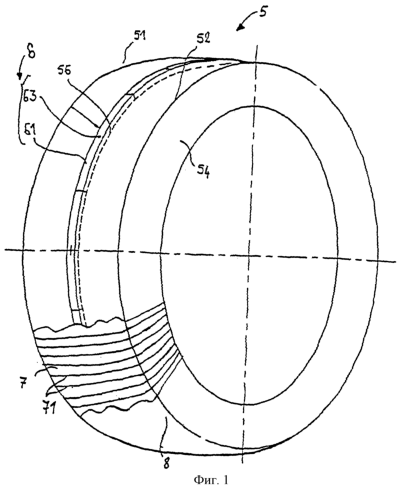 Как показано на разрыве, представленном на фиг.1, после осуществления этой операции периферийную часть вулканизационной формы покрывают (включая металлический венец 6) тканью 7, которая может быть эластомерной и подкрепленной параллельными арамидными нитями 71 и которую размещают на вулканизационной форме таким образом, чтобы нити усиления были ориентированы в радиальном направлении. Эта ткань 7 обеспечивает положение, при котором металлические элементы 61 остаются заключенными в этой вулканизационной форме 5, не мешая при этом ее эластичному растяжению. Действительно, поскольку нити 71 ткани 7 располагаются радиально, они допускают радиальное расширение этой вулканизационной формы 5.
