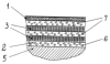 Нанесение покрытия непосредственно на поверхность защищаемого объекта состоит из следующих основных операций: А) подготовка металлической поверхности (5), Б) формирование внутреннего слоя (2) покрытия заданной толщины с использованием смеси диэлектрического связующего вещества и одного или нескольких описанных выше гранулированных материалов; В) приклеивание к внутреннему слою (2) покрытия первого полотна текстильного материала (3); Г) нанесение на первое полотно текстильного материала слоя (4) диэлектрического связующего вещества (вещество также может содержать гранулированный материал в указанном выше количестве) и приклеивание второго полотна (3); Д) приклеивание на второе полотно наружного слоя (1) из резины. В случае, если защита объекта поглощающим ЭМВ покрытием проводится путем драпировки, изготовление покрытия проводится в обратной последовательности, а на внутренний слой (2) покрытия дополнительно приклеивается металлическая фольга.