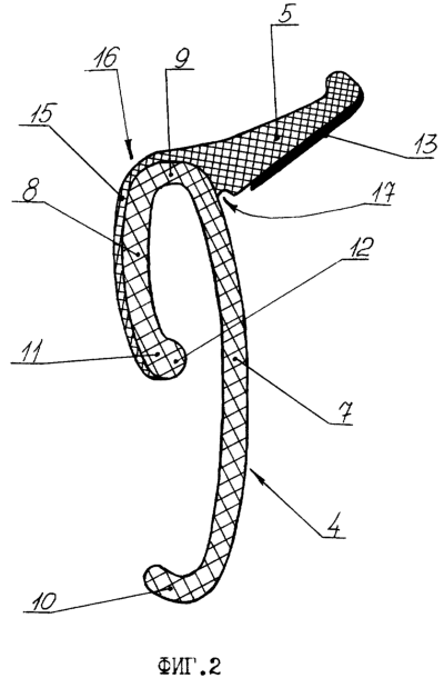 Основное тело 4 профиля уплотнителя 1 выполнено С-образной формы с возможностью охвата фланца 6 оконного проема двери 3 и образовано центральной 7 и верхней 8 стенками, соединенными между собой перемычкой 9, причем концевой участок 10 упомянутой центральной стенки 7 представляет собой отгиб (см. фигуру 2). Концевой участок 11 верхней стенки 8 основного тела 4 выполнен слегка отогнутым в сторону расположения центральной стенки 7 с возможностью упора во фланец 6 оконного проема двери 3, причем на упомянутом концевом участке 11 может быть выполнен слегка скругленный бортик 12.