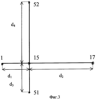 Приемные антенны 15, 16, 17, 51 и 52 размещаются таким образом, что измерительные базы образуют несимметричный геометрический крест, в пересечении которого помещается антенна 15 измерительного канала (фиг.3). При этом меньшие базы d1 и d3 образуют грубые, но однозначные шкалы пеленгации, а большие базы d5 и d6 – точные, но неоднозначные шкалы пеленгации: