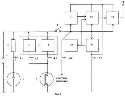 Для перевода транспортного средства в режим охраны, то есть включения противоугонной системы, владелец опять подносит постоянный магнит к геркону 7. В этом случае срабатывает обмотка 5 и дистанционный перключатель 3 переводится во второе устойчивое состояние, при котором контакты 4.1, 5.1 и 5.2 замыкаются, а контакты 4.2 размыкаются. Данная ситуация показана на фиг 1. При этом напряжение питания через токоограничивающий резистор 2 и замкнутые контакты 5.1 поступает на светодиод 6, который срабатывает и сигнализирует владельцу о том, что противоугонная система включена.