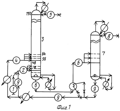 Сырье (смесь бедного+богатого сырья в соотношении 1:1) подается по линии 1 на нагрев способом прямого смешивания с горячим десорбированным экстрагентом ДМФА в соотношении 1:3 с температурой не менее 124°С, который поступает по линии 9. Полученная жидкая смесь по линии 2 с температурой 100°С подается в колонну 3 на 85 (55) карман тарелки. При встрече с верхним, жидким потоком температура смеси снижается от 100°С до 72°С. На 120 (105) тарелку по линии 4 подается экстрагент ДМФА остальной до соотношения с вводимым сырьем 5-8:1 и температурой 50°С. Колонна 3 имеет 150 колпачковых тарелок и работает с флегмовым числом 1,6.