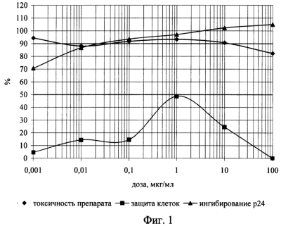 Исследование противовирусной активности соединений в отношении ВИЧ-1 проводят на перевиваемой линии чувствительных клеток МТ-4. Для заражения используют супернатант инфицированных клеток, хранящийся в жидком азоте, множественность заражения составляет 0,2-0,5 инфекционных единиц на клетку. Суспензию клеток МТ-4 с концентрацией 2,0×106 клеточных частиц в миллилитре и жизнеспособностью не менее 90% помещают в лунки 96-луночного планшета непосредственно после внесения вируссодержащего материала и сразу же добавляют исследуемые соединения, разведенные в среде RPMI-1640 без сыворотки, до конечных концентраций 0,0001-100 мкг/мл (по три лунки на каждую дозу). Контролями служат инфицированные ВИЧ-1 клетки МТ-4 без добавления препарата (вместо препарата вносят такое же количество среды RPMI-1640 без добавок) и неинфицированные клетки.